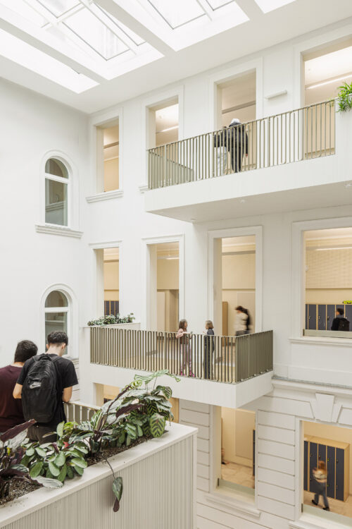 In diesen zentralen Luftraum ragen neue Balkone, als spielerische Erweiterung des Ganges, die zu neuen Pausenflächen und Lernzonen mutieren. Von diesem Zentrum aus erfolgt die Erschließung der Schule.