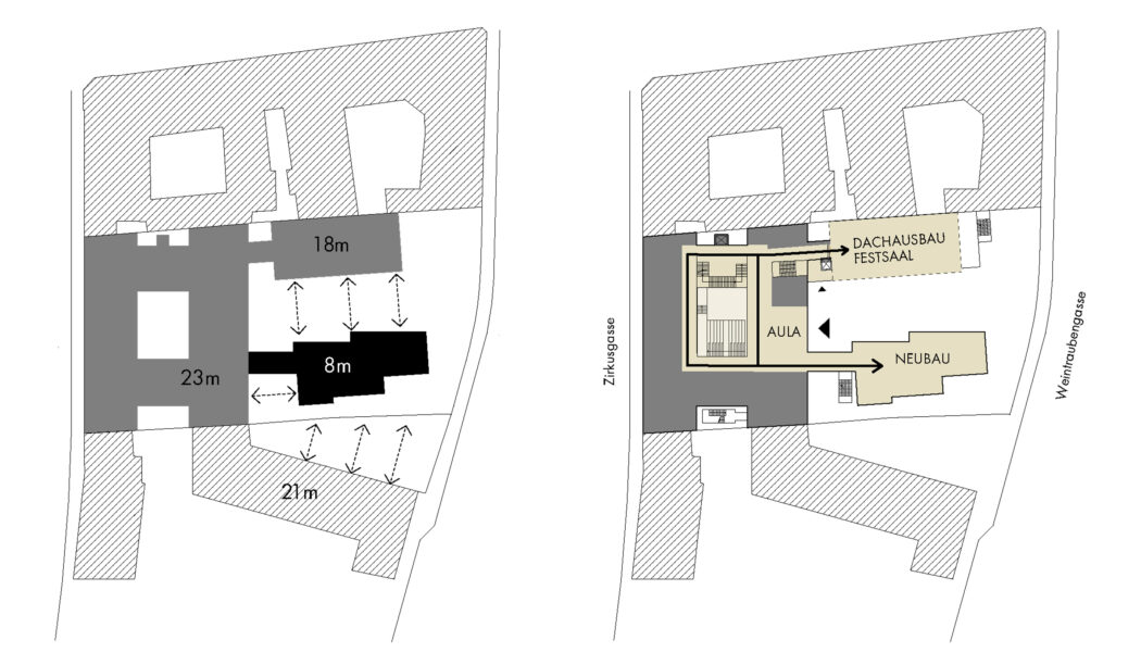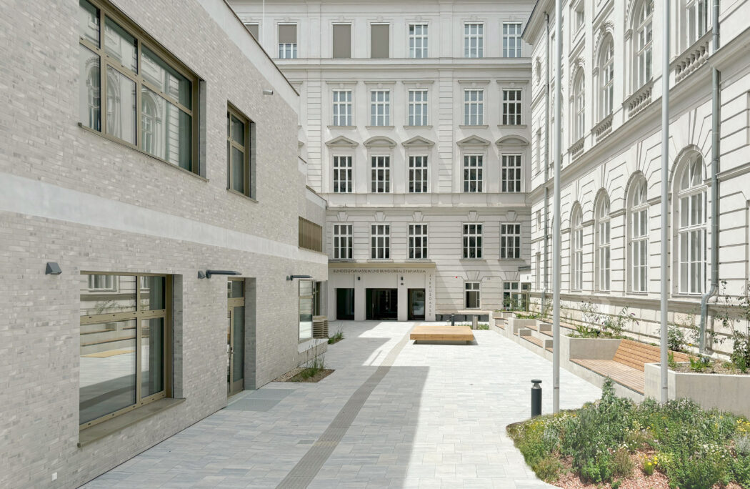 Der neue Baukörper nimmt über Terrassen eine kommunikationsfördernde Beziehung mit dem Vorplatz auf. Der neue Turnsaal wird vollständig unter der Erde situiert, um das große Volumen nicht nach außen treten zu lassen.