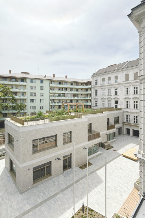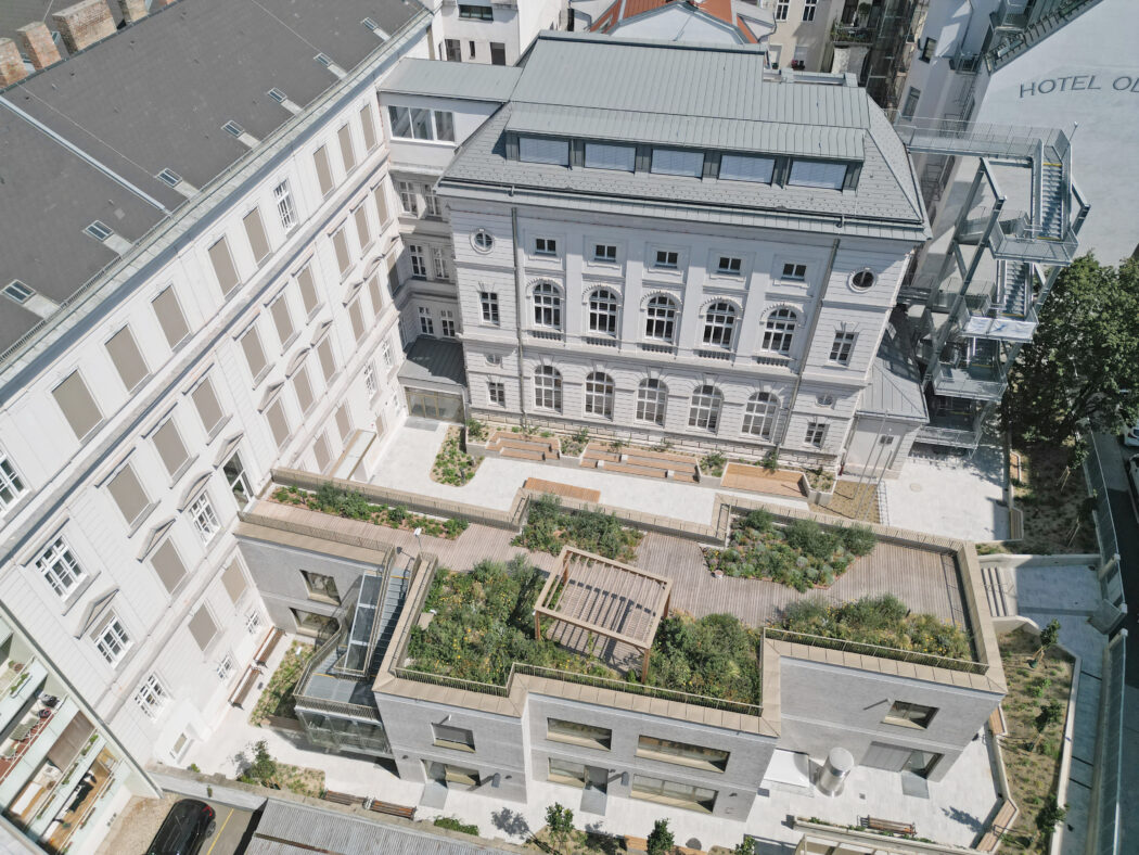 Der zweigeschoßige Zubau im Hof bildet zusammen mit dem denkmalgeschützten Festsaaltrakt einen Vorplatz und führt zu dem klar definierten neuen Haupteingang.