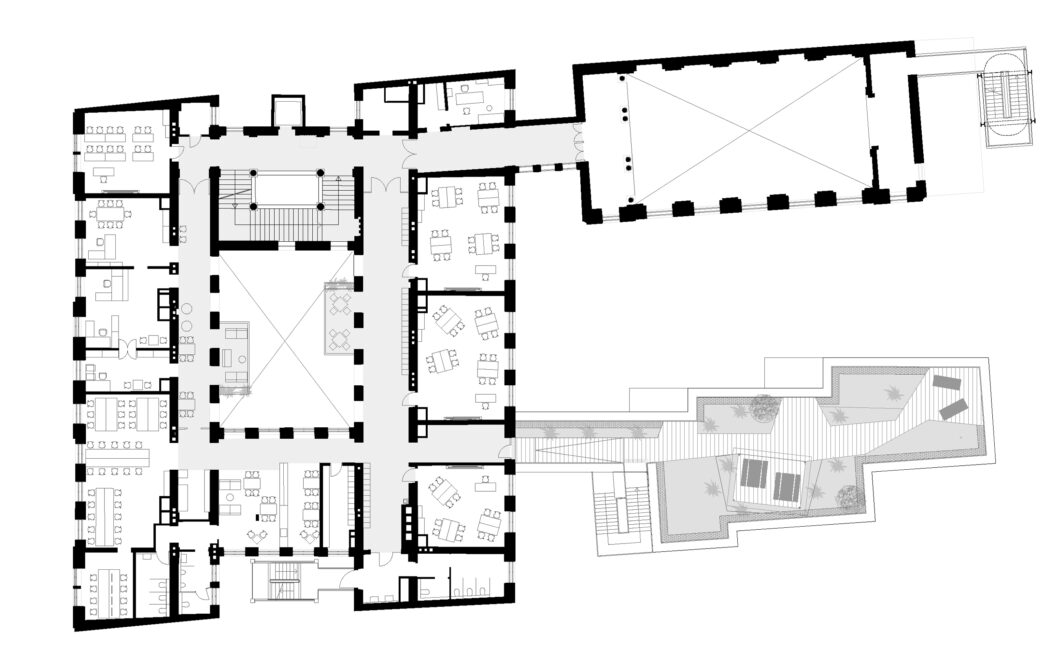 Der davor ungenutzte Innenhof wird durch ein Glasdach geschlossen und bildet einen mehrgeschoßigen kommunikativen Luftraum, ein lichtdurchflutetes Atrium. Eine Sitzstufenanlage ersetzt das dunkle Kellergeschoß und wird direkt mit dem besehenden Stiegenhaus verbunden.