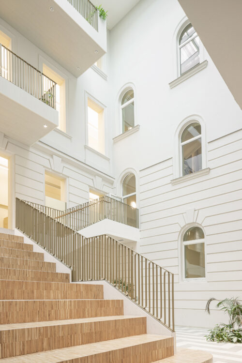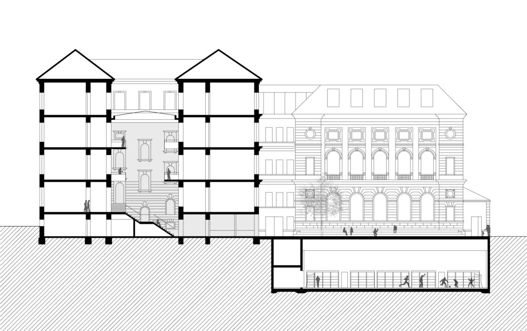 Bei der Anbindung von Alt zu Neu wird auf eine rhythmische Einbindung in das historische Fassadenbild Wert gelegt. Die Materialien und Farben der Fassaden und Innenräume wurden sorgfältig ausgewählt, um mit dem historischen Gebäude zu harmonieren.